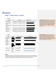 ~ FRONTEX ANNEX 7 - CONTACT DETAILS - FRONTEX 1. General Authority Address !Email address Commented [A49] : The blanked out parts contain detailed information related to means of communication used by law enforcement officials. Their disclosure would lead to possible Frontex (HQ) Rondo ONZ 1, 00-124 Warsaw, Poland frontex@frontex.europa.eu abusive usage and harm the course of future and ongoing operations, and thus facilitate irregular migration. Therefore, Frontex Situation Rondo ONZ 1, 00-124 Warsaw , Poland public security will be affected. In light of the above the text Centre is not disclosed pursuant to the exception laid dow n in the first indent of Article 4(1 )(a) of Regulation No 1049/ 2001 relating to the protection of the public interest as regards Alexis Operational Rondo ONZ 1, 00-124 Warsaw , Poland public security. Team OPERA team Rondo ONZ 1, 00-124 Warsaw, Poland JORA team Rondo ONZ 1, 00-124 Warsaw , Poland FOSS team Rondo ONZ 1, 00-124 Warsaw , Poland 2. Commented [ASO] : The blanked out parts contain the .. [F ronte names and contact details of actors participating in Frontex activities. The disclosure of such information would Role Name Phone nu mber Email address undermine the protection of the privacy and the integrity of the individuals, in particular in accordance with EU laws Operational regarding the protecti on of personal data . In thi s regard those parts are not disclosed pursuant to t he except ion laid down i n •- Manager Article 4(1 )(b) of Regulat ion (EC) 1049/2001• Front ex Coordinating Officer Operational Analyst Spokesperson lza bella +48 667667292 izabella.coope r@f ro ntex.europa.eu Cooper Press Officer Ewa +48 785001374 ewa . moncure@ frontex. europa. eu Moncure REMARK: Any changes rela t ed t o t he contact details of t he participants i n the course of the joi nt operat ion do not require t he amendment of t he Operationa l Plan. The updat ed con t act details will be available and shared with the participant s durin g implementation phase on a need to know basis. 27 / 27