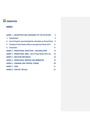 ...... ::::::: FRONTEX INDEX ANNEX 1 - DESCRIPTION AND ASSESSMENT OF THE SITUATION 3 1. Introduction 3 2. List of Airports recommended for Activation as Focal Points 5 3. Tasking of Focal Points officers during Focal Points 2014 11 4. Conclusion 11 ANNEX 2 - OPERATIONAL OBJECTIVES AND INDICATORS 14 ANNEX 3 - OPERATIONAL AREA - List of Focal Points 2014 Air 16 ANNEX 4 - DEPLOYED RESOURCES 18 ANNEX 5 - OPERATIONAL BRIEFING AND DEBRIEFING 19 ANNEX 6 - COMMAND AND CONTROL SCHEME 20 ANNEX 7 - JORA 21 ANNEX 8 - CONT ACT DETAILS 27