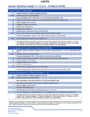 LIMITED Annex: Statistics weeks 11-12 (12 – 25 March 2018) In 2018 (1 January - 25 March 2018) 117 Incidents related to irregular migration occurred. 4 505 Irregular migrants were apprehended. Main nationalities: SYR (1 635), IRQ (1 313), AFG (534) and XXA/KWT (126). 18 Incidents on prevention of departure, with an estimated 790 would-be migrants at sea. 32 People smugglers were arrested. 12 Smugglers of goods were arrested. 10 Persons were refused entry. 16 Fatalities were reported. 55 SAR operations, involving the rescue of 2 093 persons. 2 476 Persons were saved by Frontex-deployed assets (60% of the total rescued). The main landing points: Lesbos (2 233), Samos (1 052), Kos (442), and Chios (287). 44% Of the migrants were detected in land, 56% at sea. The Reporting Points (secondary movements towards Italy) reported 466 incidents involving 1 141 irreg- ular migrants and 38 people smugglers. Two persons attempted to avoid border control, 163 persons were involved in document fraud, and 892 clandestine migrants were apprehended. From the beginning of the operation on 1 February to 25 March 2018 Incidents related to irregular migration occurred (85 in operational area ‘J’ and 2 in operational area 87 ‘K’). 2 816 Irregular migrants were apprehended. The main nationalities: SYR (1 159), IRQ (763), AFG (328), and PSE (85). 8 Incidents on prevention of departure, with an estimated 400 would-be migrants at sea. 18 People smugglers were arrested. 4 Smugglers of goods were arrested. 8 Person was refused entry. 34 SAR operations, involving the rescue of 1 504 persons. The main landing points: Lesbos (1410), Samos (627), Kos (373), Leros (78) and Chios (107) During the reporting period 12 – 25 March 2018 (weeks 11 – 12) 22 Incidents related to irregular migration occurred. 908 Irregular migrants were apprehended. Main nationalities: SYR (428), IRQ (222), AFG (69) and XXA/KWT (50). No Incidents on prevention of departure of would-be migrants at sea. 2 People smugglers were arrested. No Person was refused entry. 7 SAR operations were launched, involving the rescue of 385 persons. The main landing points: Lesbos(570),Kos (122), RU Agathonisi (114), Chios(58) and RU Megisiti (27). The Reporting Points (secondary movements towards Italy) reported 54 incidents involving 121 irregular migrants and 2 people smugglers. 19 person attempted to avoid border control, 19 persons were in- volved in document fraud, and 92 clandestine migrants were apprehended. Disclaimer: all the figures in this report including those in the tables and charts are based on data extracted from the Joint Operation Reporting Application (JORA) as of 26 Mar 2018, at 15:00 hrs and and are subject to change due to the continuous processing of inci- dents. Statistics related to Turkish actions are sourced from Turkish Coast Guard publications. Frontex Operations Division Risk Analysis Unit +48 22 205 95 00 5 Warsaw, Poland www.frontex.europa.eu