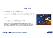 Legal basis ■ Article 82 of the EBCG Regulation 2.0; Frontex statutory staff of the European Border and Coast Guard Standing Corps (Category 1) can perform their tasks during the deployment, which may requfre the use of force, ;ncluding carrying and use of service weapons. ■ Article 55 (5) c of the EBCG Regulation 2.0; Establish specific rules to be adopted by the Management Board to facilitate the storage of weapons, ammuniUon and other equipment in secured facilities and the;r transportaUon to the operational areas i:S FRONT EX 11111 EUROPEAN BORDER AND COAST GUARD AGENCY