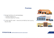 Premises • Storage facilit ies will need premises; -·..=· .·••••... ° Frontex property or; 0 Premises leased by Frontex; - .. , ...••· .... ·•• ■ In some specific cases - resources provided by host country, may be used. lku.m- : . . ..n - i5:: FRONT EX Ill EUROPEAN BORDER A N D COAST GUARD AGENCY