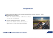 Transportation • Appliance of the highest international standards and national regulatory bases; • Movement and circulation: 0 f ram the central warehouse to the field and back; 0 Across operational areas. • Capacity for transportation of weapons; 0 part of the FWC for delivery of weapons or 0 specific contractual capacity established; i:S FRONT EX Ill EUROPEAN BORDER AND COAST GUARD AGENCY