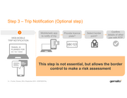 Step 3 – Trip Notification (Optional step) • WEB-MOBILE 3 TRIP NOTIFICATION Mobile/web app to notify of trip Provide licence . plate? . Select border point? Confirm details of other pax with RTP ABC-123 . . TRAVEL IS PLANNED FOR xx / xx / xxxx This step is not essential, but allows the border control to make a risk assessment 14 Frontex, Warsaw, 25th of September 2018 -CONFIDENTIAL- gernaJtox