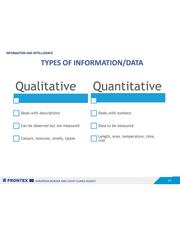 INFORMATION AND INTELLIGENCE TYPES OF INFORMATION/DATA Qualitative Quantitative |] Deals with descriptions | Deals with numbers | Can be observed but not measured | Data to be measured Length, area, temperature, time, | Colours, textures, smells, tastes cost SZ FRONTEX EB zuROPEAN BORDER AND COAST GUARD AGENCY AB