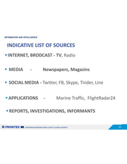 INFORMATION AND INTELLIGENCE INDICATIVE LIST OF SOURCES = INTERNET, BRODCAST - TV, Radio = MEDIA - Newspapers, Magazins = SOCIAL MEDIA - Twitter, FB, Skype, Tinder, Line = APPLICATIONS - Marine Traffic, FlightRadar24 = REPORTS, INVESTIGATIONS, INFORMANTS SS FRONTEX BE zuRroPEAN BORDER AND COAST GUARD AGENCY 45