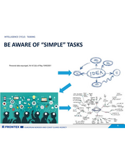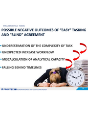 INTELLIGENCE CYCLE: TASKING POSSIBLE NEGATIVE OUTCOMES OF “EASY” TASKING AND “BLIND” AGREEMENT = UNDERESTIMATION OF THE COMPLEXITY OF TASK = UNEXPECTED INCREASE WORKFLOW = MISCALCULATION OF ANALYTICAL CAPACITY = FALLING BEHIND TIMELINES SZ FRONTEX BE zuRroPEAN BORDER AND COAST GUARD AGENCY