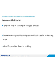 VULNERABILITY ASSESSMENT- IDENTIFICATION , DESCRIPTION AND MEASUREMENT Learning Outcomes = Explain role of tasking in analysis process = Describe Analytical Techniques and Tools useful in Tasking step; = Identify possible flaws in tasking; SZ FRONTEX EB zuRroPEAN BORDER AND COAST GUARD AGENCY