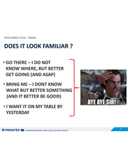 INTELLIGENCE CYCLE: TASKING DOES IT LOOK FAMILIAR ? = GO THERE - I DO NOT KNOW WHERE, BUT BETTER GET GOING (AND ASAP) = BRING ME - I DONT KNOW WHAT BUT BETTER SOMETHING A (AND IT BETTER BE GOOD) 2 e AYE AYE;SIR! ‘ = I WANT ITON MY TABLE BY YESTERDAY SZ FRONTEX BE zuRroPEAN BORDER AND COAST GUARD AGENCY