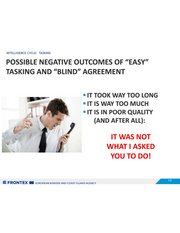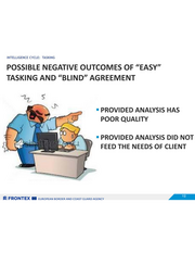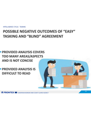 INTELLIGENCE CYCLE: TASKING POSSIBLE NEGATIVE OUTCOMES OF “EASY” TASKING AND “BLIND” AGREEMENT = PROVIDED ANALYSIS COVERS TOO MANY AREAS/ASPECTS AND IS NOT CONCISE = PROVIDED ANALYSIS IS DIFFICULT TO READ SZ FRONTEX BEE zuROPEAN BORDER AND COAST GUARD AGENCY