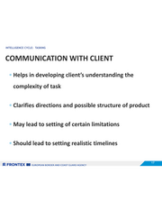 INTELLIGENCE CYCLE: TASKING COMMUNICATION WITH CLIENT » Helps in developing client’s understanding the complexity of task » Clarifies directions and possible structure of product » May lead to setting of certain limitations = Should lead to setting realistic timelines Wi SZ FRONTEX BEE zuROPEAN BORDER AND COAST GUARD AGENCY (ARE