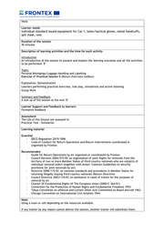 Vests Learner needs individual standard issued equipment for Cat 1, latex/tactical gloves, metal handcuffs, spit mask, vest Duration of the session 45 minutes Description of learning activities and the time for each activity Introduction An introduction of the session to present and explain the learning outcomes and all the activities to be performed. 5’ Topic: Personal Belongings/Luggage Handling and Labelling Exercise nº Practical Session 5 (Return Exercises toolbox) Explanation, Demonstration Learners performing practical exercises, role play, simulations and active listening Group Work Summary and Feedback A sum up of the session at the end. 5’ Learner Support and Feedback to learners Formative feedback Assessment The LOs of this Session are assessed in: Practical Test - Simulation Learning material Essential - EBCG Regulation 2019/1896 - Code of Conduct for Return Operations and Return Interventions coordinated or organised by Frontex Recommended - Guide for Return Operations by Air organised or coordinated by Frontex - Council Decision 2004/573/EC on organisation of joint flights for removals from the territory of two or more Member States of third-country nationals who are subjects of individual removal orders (together with Annex: Common Guidelines on security provisions for joint removals by air) - Directive 2008/115/EC on common standards and procedures in Member States for returning illegally staying third-country nationals (Return Directive) - Council Directive 2003/110/EC on assistance in cases of transit for the purposes of removal by air - Charter Of Fundamental Rights Of The European Union (2000/C 364/01) - Convention for the Protection of Human Rights and Fundamental Freedoms 1953 - Tokyo Convention on offences and Certain Other Acts Committed on Board Aircraft 1963 - Chicago Convention on International Civil Aviation 1944 Note: Using a room or cell depending on the resources available. If any trainer by any reason cannot deliver the session, another trainer will substitute them.