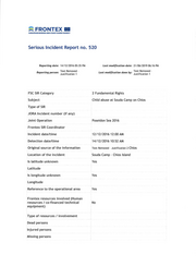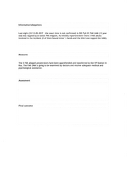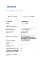 :== FRONTEX Ill EUROPEAN BORDER AND COASTGUARD AGENCY Serious Incident Report no. 520 Reporting date: 14/12/2016 05:35 PM Last modification date: 21/06/2019 06 :16 PM . Text Removed - Reportmg person: Justification 1 Last modification done by: j~:t~f~i:~~e~ - FSC SIR Category 2 Fundamental Rights Subject Child abuse at Souda Camp on Chios Type of SIR JORA Incident number (if any) Joint Operation Poseidon Sea 2016 Frontex SIR Coordinator Incident date/time 12/12/2016 12:00 AM Detection date/time 14/12/2016 10:52 AM Original source of the information Text Removed - Justification 2 Chios Location of the incident Souda Camp - Chios Island Is latitude unknown Yes Latitude Is longitude unknown Yes Longitude Reference to the operational area Yes Frontex resources involved (Human resources I co-financed technical No equipment) Type of resources I involvement Dead persons Injured persons Missing persons