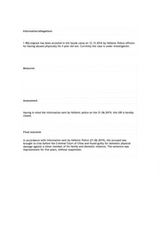 Information/allegations 1 IRQ migrant has been arrested in the Souda camp on 12.12.2016 by Hellenic Police officers for having abused physically his 4 year old son. Currently the case is under investigation. Measures Assessment Having in mind the information sent by Hellenic police on the 21.06 .2019, this SIR is hereby closed . Final outcome In accordance with information sent by Hellenic Police (21.06.2019), the accused was brought to trial before the Criminal Court of Chios and found guilty for domestic physical damage against a minor member of his family and domestic violence . The sentence was imprisonment for five years, without suspension.