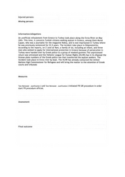 Inju red persons Missing persons Information/allegations An unofficial refoulement from Greece to Turkey took place along the Evros River on May 24th. This time, it concerns Turkish citizens seeking asylum in Greece, among them Murat ~apan, who was a journalist for the magazine Nokta, and is now imprisoned in Turkey where he was previously sentenced for 22,5 years. The incident toke place in Didymoteicho. According to the reports , on 2 June at 9am, a family of six, including an infant, and three men who wished to apply for international protection in Greece because of persecution in Turkey were handed over by Greek police to a group of masked gunmen.The unprocessed return was witnessed and the Hellenic League for Human Rights (HLHR) has in its disposal the license plate numbers of the Greek police van that transferred the asylum seekers . The incident took place in Evros river by boat. The HLHR has already contacted the United Nations High Commissioner for Refugees and will bring the matter to the attention of Greek courts and tribunals Measures Text Removed - Justification 2 and Text Removed - Justification 2 initiated FR SIR procedure in order start FR procedure official. Assessment Final outcome