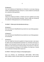 20 Zu Nummer 9: Durch die Erweiterung der Möglichkeiten der Wirtschaft von nach dieser Änderung erteilten Probefahrtbescheinigungen Gebrauch zu machen entsteht für die Wirtschaft kein zusätzlicher Erfüllungsaufwand. Zu Nummer 10,: Aufgrund der Änderung ist die/der zu Prüfende nicht mehr verpflichtet, dem Antrag eine Kopie des Personalausweises beizufügen. Dadurch entfällt eine Anforderung. Ein zusätzlicher Erfüllungsaufwand für die Wirtschaft besteht nicht. Zu Artikel 3-Änderung der See-Sportbootverordnung -: Zu Nummer 1: Durch die Änderung der Begriffsbestimmung entsteht kein neuer Erfüllungsaufwand für die Wirtschaft. Zu Nummer 2: Durch die Änderung der Begriffsbestimmung entsteht kein neuer Erfüllungsaufwand für die Wirtschaft. Zu Nummer 3: Durch den Wegfall der Kennzeichnungspflicht für Wassermotorräder in den benann- ten Fällen wird kein Erfüllungsaufwand hinsichtlich der vorhandenen Fahrzeuge ein- gespart, da die Kennzeichen bereits erteilt worden sind und auch bisher keine Ver- pflichtung zu einer Erneuerung der Zulassung bestand. Eine Ersparnis im Falle even- tuell neu zuzulassender Fahrzeuge ist nicht bezifferbar. Die Anzahl der in Zukunft neu zuzulassenden Fahrzeuge dürfte marginal sein. •Zu Artikel 4-Änderung der Anlage zum Seeaufgabengesetz -: Durch die Aufnahme der Entschließungen MEPC.246(66), MEPC.247(66), MEPC.248(66) und MEPC.251(66) entsteht für die Wirtschaft kein über die internati-