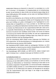 45 redaktionellen Änderung von Abschnitt A in Abschnitt C zu verschieben (s.o. zu Arti- kel 1: Zu Nummer 1: Zu Buchstabe b: Zu Doppelbuchstabe dd: Zu Dreifachbuchsta- be bbb). Da die Richtlinien für ältere Schiffe noch die Berechnungsgrundlage des für diese Schiffe geltenden EEDI darstellen, sind sie neben den Nachfolgerrichtlinien in Abschnitt C aufzuführen. Der EEDI ist eine Maßnahme, die im Rahmen der IMO als verbindlicher Richtwert für die CO 2-Emissionen von neu gebauten Schiffen ab 2013 festgelegt wurde. Der Index gibt je nach Schiffstyp und -größe in Abhängigkeit von der Tragfähigkeit ein zu errei- chendes Maß an Energieeffizienz pro Tonne und Meile vor. Der EEDI kann durch technische und schiffbauliche Maßnahmen beeinflusst werden. Durch das schrittwei- se Anziehen des Referenzlevels für den vorgeschriebenen EEDI alle 5Jahre soll ei- ne dauerhafte Weiterentwicklung der Reduzierung des Treibstoffverbrauchs durch technische Innovationen beim Schiffsbau erreicht werden. Die Formel und Faktoren zur Errechnung des erreichten EEDI eines Schiffes, der unter dem vorgeschriebenen Wert der Referenzlinie des jeweiligen Schiffstyps liegen muss, finden sich in den vor- genannten Richtlinien sowie den Nachfolgerrichtlinien. Durch die Entschließung MEPC.224(64) wurden Änderungen der Richtlinien von 2012 angenommen, die die Berücksichtigung von Wellengeneratoren und -motoren bei der Berechnung des erreichten EEDI betreffen. Die Entschließung MEPC.245(66) enthält die nachfolgenden Richtlinien von 2014 über die Methode zur Berechnung des erreichten Energieeffizienz-Kennwerts (EEO!) für Schiffsneubauten, die die Richtlinien von 2012 ablösen. Die Entschließungen MEPC.263(68) und MEPC.281(70), letztere korrigiert durch MEPC 70/18/Add.1/Corr.1, enthalten Änderungen der Richtlinien von 2014. Zu Dreifachbuchstabe ccc: Die Richtlinien von 2013 für die Berechnung von Referenzlinien zur Verwendung in Verbindung mit dem EEDI (MEPC.231(65)) und die Richtlinien von 2013 für die Be- rechnung von Referenzlinien zur Verwendung in Verbindung mit dem EEDI von für Kreuzfahrten eingesetzten Fahrgastschiffen mit nicht-konventionellen Antriebssyste- men (MEPC.233(65)) schreiben vor, wie die Referenzlinie für bestimmte Schiffstypen zu berechnen ist. Die Referenzlinie wird wiederum als Bezugspunkt für die Berech- nung des vorgeschriebenen EEDI nach Regel 21 der Anlage VI des MARPOL- Übereinkomrnens benutzt.