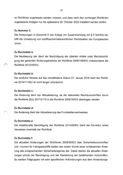 47 en Richtlinien zugelassen werden müssen, und dass nach den vorherigen Richtlinien zugelassene Anlagen nur bis spätestens 28. Oktober 2020 installiert werden dürfen. Zu Nummer 3: Die Änderungen in Abschnitt D der Anlage (im Zusammenhang mit § 5 SchSG) be- trifft die Umsetzung von schiffssicherheitsrechtlichen Rechtsakten der Europäischen Union. Zu Buchstabe a: Die Neufassung der dient der Berichtigung der zitierten Artikel unter Berücksichti- gung der gesamten Änderungshistorie der Richtlinie 2008/106/EG, insbesondere der Richtlinie 2012/35/EU. Zu Buchstabe b: Der amtliche Hinweis auf das Inkrafttretens Datum 01. Januar 2016 nach der Richtli- nie 2014/111/EU ist nicht länger erforderlich. Zu Buchstabe c: Die Änderung dient der Aktualisierung, da die relevanten Rechtsvorschriften durch die Richtlinie (EU) 2017/2110 in die Richtlinie 2009/16/EG übertragen werden. Zu Buchstabe d: Die Änderung dient der Aktualisierung des Fundstellennachweises. Zu Buchstabe e: Die redaktionelle Berichtigung der Richtlinie 2014/90/EU dient der Korrektur eines Verweises innerhalb der Richtlinie. Zu Buchstabe f: Die aktuellen Änderungen der Richtlinien 2009/45/EG über Sicherheitsvorschriften und —normen für Fahrgastschiffe stellen den ersten Schritt einer umfassenden Ände- rung des entsprechenden Sicherheitsregimes dar. Dabei dienen die aktuellen Ände- rungen primär der Bereinigung und der Klarstellung der bestehenden Vorschriften. So werden Fallgruppen mit sehr spezifischen Anforderungen aus dem Anwendungs-
