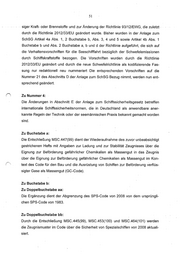 51 siger Kraft- oder Brennstoffe und zur Änderung der Richtlinie 93/12/EWG, die zuletzt durch die Richtlinie 2012/33/EU geändert wurde. Bisher wurden in der Anlage zum SchSG Artikel 4a Abs. 1, 2 Buchstabe b, Abs. 3, 4 und 5 sowie Artikel 4b Abs. 1 Buchstabe b und Abs. 2 Buchstabe a, b und d der Richtlinie aufgeführt, die sich auf die Verhaltensvorschriften für die Seeschifffahrt bezüglich der Schwefelemissionen durch Schiffskraftstoffe bezogen. Die Vorschriften wurden durch die Richtlinie 2012/33/EU geändert und durch die neue Schwefelrichtlinie als kodifizierende Fas- sung nur redaktionell neu nummeriert Die entsprechenden Vorschriften auf die Nummer 21 des Abschnitts D der Anlage zum SchSG Bezug nimmt, werden nun ent- sprechend geändert. Zu Nummer 4: Die Änderungen in Abschnitt E der Anlage zum Schiffssicherheitsgesetz betreffen internationale Schiffssicherheitsnormen, die in Deutschland als anwendbare* aner- kannte Regeln der Technik oder der seemännischen Praxis bekanntgemacht worden sind. Zu Buchstabe a: Die Entschließung MSC.447(99) dient der Wiederaufnahme des zuvor unbeabsichtigt gestrichenen Hefts mit Angaben zur Ladung und zur Stabilität Zeugnisses über die Eignung zur Beförderung gefährlicher Chemikalien als Massengut in das Zeugnis über die Eignung zur Beförderung gefährlicher Chemikalien als Massengut im Kon- text des Code für den Bau und die Ausrüstung von Schiffen zur Beförderung Verflüs- sigter Gase als Massengut (GC-Code). Zu Buchstabe b: Zu Doppelbuchstabe aa: Die Ergänzung dient der Abgrenzung des SPS-Code von 2008 von dem ursprüngli- chen SPS-Code von 1983. Zu Doppelbuchstabe bb: Durch die Entschließung MSC.445(99), MSC.453(100) und MSC.464(101) werden die Zeugnismuster im Code über die Sicherheit von Spezialschiffen von 2008 aktuali- siert.