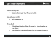 EES Requirements Verification (1:1) • face matching or four fingers match Identification (1:N) • 4 fingers match Important: • if facial verification fails - fingerprint identification is mandatory • identification requires fingerprint capture and match
