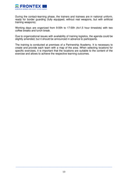 During the contact-learning phase, the trainers and trainees are in national uniform, ready for border guarding (fully equipped, without real weapons, but with artificial training weapons). Working days are organized from 9:00h to 17:00h (4x1,5 hour timeslots) with two coffee breaks and lunch break. Due to organizational issues with availability of training logistics, the agenda could be slightly amended, but it should be announced in advance to participants. The training is conducted at premises of a Partnership Academy. It is necessary to create and provide each team with a map of the area. When selecting locations for specific exercises, it is important that the locations are suitable to the content of the exercise and allows to achieve the respective learning outcomes. __________________________________________________________________________________ 13