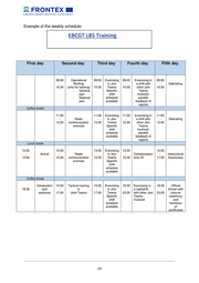 Example of the weekly schedule: EBCGT LBS Training 2019 First day Second day Third day Fourth day Fifth day 09:00 Operational 09:00 Exercising 09:00 Exercising in 09:00 - Briefing - in Join - a shift with - Debriefing 10:30 (only for training) 10:30 Teams 10:30 other Join 10:30 - General Specific Teams part shift involved- - National schedule parallel part available feedback of reports Coffee break 11:00 11:00 Exercising 11:00 Exercising in 11:00 - Radio - in Join - a shift with - Debriefing 12:30 communication 12:30 Teams 12:30 other Join 12:30 exercise Specific Teams shift involved- schedule parallel available feedback of reports Lunch break 13:30 13:30 13:30 Exercising 13:30 13:30 - Arrival - Radio - in Join - Compensation - Intercultural 15:00 15:30 communication 15:30 Teams 15:30 time off 17:30 Awareness exercise Specific shift schedule available Coffee break Introduction 15:30 Tactical training 15:30 Exercising 19:30 Exercising in 18:30 Official 18:30 and - in - in Join - a nightshift - Dinner with welcome 17:00 Joint Teams 17:00 Teams 23:00 with other Join 23:00 closure Specific Teams ceremony shift involved and schedule handover available of certificates __________________________________________________________________________________ 14
