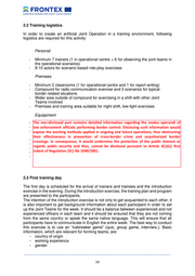 2.2 Training logistics In order to create an artificial Joint Operation in a training environment, following logistics are required for this activity: Personal - Minimum 7 trainers (1 in operational centre + 6 for observing the joint teams in the operational scenarios) - 8-10 actors for scenario based role-play exercises Premises - Minimum 2 classrooms (1 for operational centre and 1 for report writing) - Compound for radio communication exercise and 3 scenarios for typical border related situations - Wider area outside of compound for exercising in a shift with other Joint Teams involved - Premises and training area suitable for night shift, low-light exercises Equippment - The non-disclosed part contains detailed information regarding the modus operandi of 7 laptops - law enforcement officials Copy-print-scan device performing border control. Disclosing such information would - expose 18 setstheof working basic methods appliedequipment border guard in ongoing and future (belt, operations, baton, thus handcuff, obstructing artificial weapons, pepper spray, torches, etc.) their effectiveness in prevention of cross-border crime and unauthorized border - crossings. ProjectorIn consequence, it would undermine the protection of the public interest as - 3 service and 1 civilian vehicles regards public - 14 radio sets security and thus, cannot be disclosed pursuant to Article 4(1)(a) first indent of Regulation (EC) No 1049/2001. - Trainer vests, 12x Frontex blue armbands, red armbands for actors - Other equipment described in the scenarios (check Annexes with Trainers packs) 2.3 First training day The first day is scheduled for the arrival of trainers and trainees and the introduction exercise in the evening. During the introduction exercise, the training plan and program are presented to the participants. The intention of the introduction exercise is not only to get acquainted to each other, it is also important to get background information about each participant in order to set up the Joint Teams for the week. It should be a balance between experienced and not experienced officers in each team and it should be ensured that they are not coming from the same country or speak the same native language. This will ensure that all participants have to communicate in English the entire week. The best way to conduct this exercise is to use an “icebreaker game” (quiz, group game, interview,). Basic information, which are relevant for forming teams, are: - country of origin - working experience - gender __________________________________________________________________________________ 16