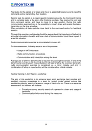 First tasks for the patrols is to locate and move to appointed locations and to report to command centre, transmitting their location. Second task for patrols is to reach specific locations given by the Command Centre and to complete tasks at the spot. After finishing one task, they receive the next task from command centre, and have to move to a new position. During the radio communication exercise there is the possibility to move 5 times and receive five tasks, depending on the time schedule. After completing all tasks patrols move back to the command centre for feedback session. Through this exercise, participants should be aware about the importance of delivering accurate information via radio and how a lack of communication could have impact in a real life situation. Radio communication exercise is more detailed in Annex VII. For the assessment, following aspects are of importance: - Usage of NATO Alphabet - Radio communication procedures - Communication and interaction among the team Average use of all three benchmarks is required for passing the exercise. If one of the benchmarks is continuously misconducted, it will lead to failing the exercise. Generally, radio communication exercise is considered as a minor mistake and only in combination of failing in report writing will be considered as critical mistake. Tactical training in Joint Teams - workshop The aim of this workshop is to enhance team spirit, exchange best practise and establish common procedures in a team for typical border related actions like establishing identity, search of a person, usage of handcuffs, etc. There is no separate assessment, but trainers will observe: o Procedures during security search of a person in a team and usage of handcuffs o Communication before and during the measures. __________________________________________________________________________________ 18