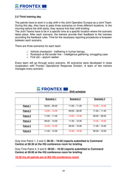 2.5 Third training day The patrols have to work in a day shift in the Joint Operation Europia as a Joint Team. During this day, they have to pass three scenarios on three different locations. In the morning before the shift starts, they receive first their shift briefing. The Joint Teams have to be in a specific time at a specific location where the scenario takes place. After each scenario, the trainers provide their feedback to the trainees according the feedback rules. Time for the necessary reporting procedures is foreseen between each scenario. There are three scenarios for each team o Vehicle checkpoint - trafficking in human beings, o Rucksack at the border line – intelligence gathering, smuggling case o First aid – asylum seeker Every team will go through every scenario. All scenarios were developed in close cooperation with Frontex Operational Response Division. A team of two trainers manages every scenario. Shift schedule Scenario 1 Scenario 2 Scenario 3 Patrol 1 09:00 – 09:45 11:00 – 11:45 14:00 – 14:45 Patrol 2 14:00 – 14:45 09:00 – 09:45 11:00 – 11:45 Patrol 3 11:00 – 11:45 14:00 – 14:45 09:00 – 09:45 Patrol 4 09:45 – 10:30 11:45 – 12:30 14:45 – 15:30 Patrol 5 14:45 – 15:30 09:45 – 10:30 11:45 – 12:30 Patrol 6 11:45 – 12:30 14:45 – 15:30 09:45 – 10:30 Duty time Patrol 1, 2 and 3: 08:30 – 16:00 (reports submitted to Command Centre) at 08:30 at the HQ conference room for briefing Duty Time Patrol 4, 5 and 6: 09:00 – 16:30 (reports submitted to Command Centre) at 09:00 at the HQ conference room for briefing 16:30 hrs all patrols are at BG HQ (conference room) __________________________________________________________________________________ 19