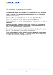 Tips for trainers for the management of the scenarios Choose a proper location for the scenario, which reflects reality as much as possible. Create a check-list for the necessary equipment and ensure that the equipment is maintained and functional. Arrive early. Give yourself time to arrange and to check all logistics with your scenario and get yourself mentally geared up for the training session. Ensure that you brief the involved actors and that they fully understand the scope of the training. Explain the participants what you’re going to cover. Introduce your exercise with a brief overview of the training subject’s main points, or simply start the exercise with arrival of the Joint Team (depends on the scenario). Ensure that participants understand the influence of stress in this particular exercise and how it can have impact on their decision making process. Do not stop or influence a running exercise / scenario! The scenario shall run without any interruption by trainers. Therefore, it is necessary that the trainers do their notes about their observations for the feedback afterwards. . __________________________________________________________________________________ 20