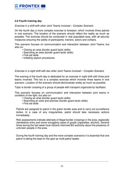 2.6 Fourth training day Exercise in a shift with other Joint Teams involved – Complex Scenario On the fourth day a more complex exercise is foreseen, which involves three patrols in one scenario. The location of the scenario should reflect the reality as much as possible. The exercise should be conducted in real populated area, with all security measures ensuring the safety of participants, trainers, actors and civilians. This scenario focuses on communication and interaction between Joint Teams, but also on: • Closing an area (border guard tactic skills) • Searching an area (border guard tactic skills) • First aid skills • Initiating asylum procedures Exercise in a night shift with two other Joint Teams involved – Complex Scenario The evening of the fourth day is dedicated for an exercise in night shift with three joint teams involved. This too is a complex exercise which involves three teams in one scenario. Location of the scenario should demonstrate reality as much as possible. Topic is border crossing of a group of people with transport organized by facilitator. This scenario focuses on communication and interaction between joint teams in condition of low light, but also on: • Closing an area (border guard tactic skills) • Searching an area and premise (border guard tactic skills) • First aid skills Patrols are assigned to patrol in the green border area and to carry out surveillance duties. In a case of any irregularities, patrol should take necessary actions immediately Risk assessments indicate attempts of illegal border crossings in the area, especially clandestine entry and some smuggling cases of goods (cigarettes, alcohol). Several times during the last week local citizens informed BG authority about the presence of unknown people in the area. During the fourth training day and the more complex scenarios it is essential that one patrol is taking the lead on the spot as multi-patrol leader. __________________________________________________________________________________ 21