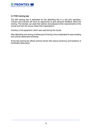 2.7 Fifth training day The fifth training day is dedicated for the debriefing like in a real joint operation. Trainers and trainees will have an opportunity to give personal feedback about the training. The trainees can state their opinion and propose further improvements of the course and how the course meets their expectations. Inventory of all equipment, which was used during the course. After debriefing and closing of official part of training, time is dedicated for team building and cultural awareness workshop. At the last evening the official common dinner with closure ceremony and handover of certificates takes place. __________________________________________________________________________________ 22
