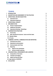 Contents 1. INTRODUCTION 26 2. DESCRIPTION AND ASSESSMENT OF THE SITUATION 26 3. OPERATIONAL AIM AND OBJECTIVES 27 3.1. Operational aim 27 3.2. Operational objectives 27 4. OPERATIONAL CONCEPT 27 5. IMPLEMENTATION 28 5.1. Period of implementation 28 5.2. Additional information 28 5.3. Operational Briefings / Debriefings 28 6. COORDINATION STRUCTURE 28 6.1. Partnership 28 6.2. Main operational structures / actors and their tasks 29 7.2.1. Member States 29 7.2.3. Frontex 29 7. COMMAND, CONTROL, COMMUNICATION AND REPORTING 29 7.1. Command and control 29 7.2. Operational communication 29 7.3. Communication with Press 30 7.4. Reporting 30 7.4.1 Reports from participants 30 7.4.2 Serious incident reporting 30 8. ORGANISATIONAL ARRANGMENTS AND LOGISTICS 31 8.1. Composition of the teams 31 8.2. Transport and lodging 31 8.3. Safety and Security Rules 31 8.4 Legal aspects of EUROPIA 31 9. EVALUATION 32 __________________________________________________________________________________ 25