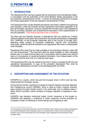 1. INTRODUCTION The Operational Plan has been agreed with the authorities of the host Member State ,1 in consultation with the authorities of the home Member States participating in the joint operation coordinated by Frontex. It covers all necessary elements for a proper and timely organization of the joint operation coordinated by Frontex. The Operational Plan contain detailed and specific information related to the particular joint operation, while the Annexes enclose operational information applicable to all joint land borders operations. Annexes complement the Main part of the Operational Plan by providing complete and comprehensive description of the implementation of the joint operation. (This training document has no Annexes) The Main part and Specific Annexes of Operational Plan are marked as “Limited” without prejudice to the public right of access to documents as laid down in Regulation (EC) 1049/2001 of the European Parliament and of the Council of 30 May 2001, regarding public access to European Parliament, Council and Commission documents, while the General Annexes to the Operational Plan have no classification mark indicated. Operational Plan shall only be made available to the authorities referred in each MS as “Law Enforcement”. This document shall be made available to other interested parties only on a need-to-know basis and in accordance with European and national rules on the protection of sensitive/classified information. Such dissemination of this document shall be done only on a case-by-case basis. This Operational Plan may be revised at any time in order to correspond with the new operational developments. A copy of the amended Operational Plan shall be immediately distributed by Frontex to the participating MS via FOSS. 2. DESCRIPTION AND ASSESSMENT OF THE SITUATION EUROPIA is a country, which has joint the Europan Union in 2014 and has fully implemented the Schengen Acquis. During the last months a significant increase of irregular migration has been detected from neighbouring country USANSKI, which is used as transit. Irregular migrants were crossing the green border mainly in the south-east. Due to political crises in North African countries, further increase of irregular migration is expected in near future. EUROPIA has therefore reinforced border control measures at the border to USANSKI and detected in coherence to these measures criminal activities an increased number of trafficking of human beings and smuggling as well. 1 For the purposes of the present document, the term “Member State” includes also the States participating in the relevant development of the Schengen acquis in the meaning of the Treaty on the Functioning of the European Union and its Protocol (No 19) on the Schengen acquis integrated into the framework of the European Union. __________________________________________________________________________________ 26