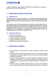 In order to tackle the current situation, EUROPIA has requested human support for border control from the European Union. 3. OPERATIONAL AIM AND OBJECTIVES 3.1. Operational aim The operational aim of the joint operation is to implement coordinated operational activities at the EU external land borders in order to control irregular migration flows towards the territory of the MS of the European Union (EU) and to tackle cross border crime. The operational aims will be implemented in full compliance with the relevant EU law, including the Charter of Fundamental Rights, the relevant international law, including the Convention Relating to the Status of Refugees from 1951, the respect for fundamental rights in particular the access to international protection and the compliance with the principle of non-refoulement and taking into account the recommendations of the Frontex Consultative Forum. 3.2. Operational objectives • Enhance border security • Enhance operational cooperation • Enhance exchange of information • Identify possible risks and threats • Establish and exchange best practices 4. OPERATIONAL CONCEPT • Provide support to local authorities in border surveillance activities at land borders; • Share experiences and exchange expertise as well as to constantly update knowledge on the irregular migration trends in order to adopt countermeasures to tackle the phenomena; • Collect and assess information in order to improve the detection of human smuggling and trafficking in human beings facilitation by individuals and/or criminal networks and assist wherever possible identification and detention of facilitators; • Provide a clear and updated situational picture concerning the operational areas, modus operandi, main trends and possible rapid changes in this respect; __________________________________________________________________________________ 27