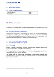 5. IMPLEMENTATION 5.1. Period of implementation 2 Commencement 18:00 Termination 24:00 5.2. Additional information A detailed duty schedule will be provided before the activity and updated on daily base. 5.3. Operational Briefings / Debriefings All participants taking part in joint operation will receive the operational briefing and debriefing delivered by representatives of Frontex and national authorities of host MS. The operational briefing will take place on Tuesday morning in the operational area; the debriefing will take place on Friday at HQ conference room. 6. COORDINATION STRUCTURE 6.1. Partnership Frontex is the EU coordinator, initiating, promoting and facilitating the EU MS synchronized efforts to control the external borders. The local authorities are the direct partners of Frontex and responsible for all border related activities within the joint operation. The home MSs will support the achievement of operational objectives and implementation of activities by deploying their resources to the defined locations in particular periods of time. 2 Foreseeable duration of the joint operation as indicated in the Article 3a (1) (b)- of the Frontex Regulation. __________________________________________________________________________________ 28