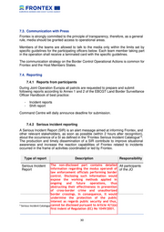 7.3. Communication with Press Frontex is strongly committed to the principle of transparency, therefore, as a general rule, media should be granted access to operational areas. Members of the teams are allowed to talk to the media only within the limits set by specific guidelines for the participating officers below. Each team member taking part in the operation shall receive a laminated card with the specific guidelines. The communication strategy on the Border Control Operational Actions is common for Frontex and the Host Members States. 7.4. Reporting 7.4.1 Reports from participants During Joint Operation Europia all patrols are requested to prepare and submit following reports according to Annex 1 and 2 of the EBCGT Land Border Surveillance Officer Handbook of best practice: - Incident reports - Shift report Command Centre will daily announce deadline for submission. 7.4.2 Serious incident reporting A Serious Incident Report (SIR) is an alert message aimed at informing Frontex, and other relevant stakeholders, as soon as possible (within 2 hours after recognition), about the occurrence of a SI as defined in the “Frontex Serious Incident Catalogue” . 3 The production and timely dissemination of a SIR contribute to improve situational awareness and increase the reaction capabilities of Frontex related to incidents occurred in the frame of activities coordinated or led by Frontex. Type of report Description Responsibility Serious Incident The non-disclosed part contains An alert message that shall be reported detailed All participants Report information immediatelyregarding the modus (within 2 hours operandi of of the JO after recognition) law to FSCenforcement officials incident in case a relevant performing border occurs control. that needs Disclosing such information urgent attention would as the incident expose may affect theor be working relevant methods applied in to, the Frontex ongoing mission, itsand futureimage, obligation, operations, thus the safety and obstructing their effectiveness security of participants in prevention in activities of cross-border coordinated or led crime and orunauthorized by Frontex, any border crossings. In consequence, it would undermine the protection of the public interest as regards public security and thus, 3 Serious Incident Cataloguecannot beindisclosed is available the Generalpursuant Annexes to Article 4(1)(a) first indent of Regulation (EC) No 1049/2001. __________________________________________________________________________________ 30