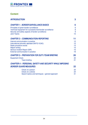 Content INTRODUCTION 3 CHAPTER 1 – BORDER SURVEILLANCE BASICS 6 Principles of green border surveillance 6 Technical equipment for successful land border surveillance 8 Security and safety aspects of border surveillance 9 Joint Teams 10 CHAPTER 2 – COMMUNICATION/REPORTING 11 Internal communication in practice 12 International phonetic alphabet (NATO/ ICAO) 12 Radio procedure words 13 Report writing 15 Serious Incident Report (SIR) 15 External communication in practice 19 CHAPTER 3 – PREPARATION FOR DUTY/TEAM BRIEFING 20 Equipment Check 20 Team briefing 21 CHAPTER 4 – PERSONAL SAFETY AND SECURITY WHILE IMPOSING BORDER GUARD MEASURES 22 Check of a person 22 Check of a vehicle 24 Search tactics and techniques – general approach 31 __________________________________________________________________________________ 34