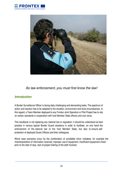 As law enforcement, you must first know the law! Introduction A Border Surveillance Officer is facing daily challenging and demanding tasks. The spectrum of action and reaction has to be adopted to the situation, environment and local circumstances. In this regard, a Team Member deployed to any Frontex Joint Operation or Pilot Project has to rely on certain standards in cooperation with host Member State officers and vice versa. This handbook is not replacing any national law or regulation; it should be understood as best practice in various typical Border Guard situations in order to facilitate, on one hand the enforcement of the national law of the host Member State, but also to ensure self- protection of deployed Guest Officers and their colleagues. Worst case scenarios occur by the combination of avoidable minor mistakes, for example the misinterpretation of information received, improper use of equipment, insufficient equipment check prior to the start of duty, lack of proper briefing of the staff involved. __________________________________________________________________________________ 35