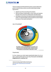 There is no need to commit the whole law to memory, but if you follow some general rules within all your actions, you will comply with general legal requirements: • adapt the use of force according to the situation; • follow the principle of proportionality in all your actions and measures, especially when using force or dealing with vulnerable people; • any limitation on the exercise of the rights and freedoms recognized by the Charter of Fundamental Rights must be provided for by law and respect 4 the essence of those rights and freedoms. Use of Force Model 5 Proportionality In all your measures you should respect proportionality between the aim you want to achieve and the means you are using. Simply spoken, do not use a sledgehammer for cracking a nut! 4 Article 52 of the Charter of Fundamental Rights of the European Union. 5 Ontario Use of Force Model (2004). 2nd July 2014,12:23 hrs, taken from internet: http://ottawa. ca/calendar/ottawa/citycouncil/opsb/2008/02- 25/item7.htm __________________________________________________________________________________ 37