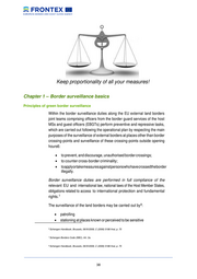 Keep proportionality of all your measures! Chapter 1 – Border surveillance basics Principles of green border surveillance Within the border surveillance duties along the EU external land borders joint teams comprising officers from the border guard services of the host MSs and guest officers (EBGTs) perform preventive and repressive tasks, which are carried out following the operational plan by respecting the main purposes of the surveillance of external borders at places other than border crossing-points and surveillance of these crossing-points outside opening hours6: • to prevent, and discourage, unauthorised border crossings; • to counter cross-border criminality; • to apply or take measures against persons who have crossed the border illegally. Border surveillance duties are performed in full compliance of the relevant EU and international law, national laws of the Host Member States, obligations related to access to international protection and fundamental rights. 7 The surveillance of the land borders may be carried out 8 by : • patrolling • stationing at places known or perceived to be sensitive 6 Schengen Handbook, Brussels, 06/XI/2006, C (2006) 5186 final, p. 75 7 Schengen Borders Code (SBC), Art. 3a. 8 Schengen Handbook, Brussels, 06/XI/2006, C (2006) 5186 final, p. 75 __________________________________________________________________________________ 38