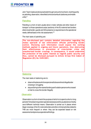 Joint Team’s tasks are done practically through various forms of work, most frequently as patrolling, observation, intensified control and ambush (stationary and mobile units). 9 Patrolling Patrolling is a form of work usually done in motor vehicles and other means of transport at those operational areas (sections) of the EU external land borders where local border guards and GOs presence is required due to the operational needs, defined base on the risk assessment. 10 The main tasks of patrolling are: The non-disclosed part contains • monitor the terrain they operate detailed in information regarding the modus• operandi of law ensure that there enforcement is no risk officials to public policy and internal performing border control. security Disclosing such information in the patrolling area would expose the working methods applied in ongoing and future operations, • check documents of persons being in the area, who are not thus obstructing their effectiveness in known to the patrol team prevention of cross-border crime and unauthorized border crossings. In consequence, • stop all suspected persons who do not have any documents and it would undermine the protection of the public interest as regards public ask them to explain in detail their reasons for being in that area security and thus, •cannot be disclosed pursuant to Article 4(1)(a) stop and bring to the nearest border guard’s station persons who first indent of Regulation (EC) No 1049/2001. crossed or tried to cross the border illegally Patrols might be reinforced with the technical means and/or dog handlers with service dogs (sniffer dogs in forest areas). Patrolling is also done on foot, especially where the terrain and landscape is not allowing patrolling by patrol vehicles or other types of technical means. Stationing The main tasks of stationing are to: • observe the places which are perceived to be sensitive to illegal border crossing or smuggling • stop and bring to the nearest border guard’s station persons who crossed or tried to cross the border illegally Observation Observation is a form of work the purpose of which is to spend a short or long period of time observing certain operational area(s) and it is usually done on foot by use of different technical means. Observation is carried out in places where illegal crossings of the EU external borders and other criminal activities related to THB are more frequent or where they can be expected based on risk assessment and previous operational findings. __________________________________________________________________________________ 39