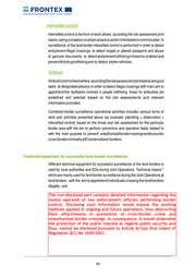 Intensified control Intensified control is the form of work where, according the risk assessment joint teams caring out tasks in a certain area at a certain time based on common plan. In surveillance of the land border intensified control is performed in order to detect and prevent illegal crossings, to detect forged or altered passports and abuse of genuine documents, to detect and prevent trafficking in firearms, to detect and prevent illicit drug trafficking and to detect stolen vehicles. Ambush Ambush is form of work where, according the risk assessment joint teams caring out tasks at designated place(s) in order to detect illegal crossings with main aim to apprehend the facilitators involved in people trafficking. Areas for ambushes are predefined and selected based on the risk assessments and relevant information provided. Combined border surveillance operational activities includes various forms of work and activities presented above (as example: patrolling + observation + intensified control) based on the threat and risk assessment for the particular border area with the aim to perform preventive and operative tasks related to with the main purpose to prevent unauthorised border crossings and to counter cross-border criminality at EU external land borders. Technical equipment for successful land border surveillance Different technical equipment for successful surveillance of the land borders is used by local authorities and GOs during Joint Operations. Technical means 11 which are mainly used for land border surveillance during the Joint Operations at land borders - with the aim to apprehend individuals crossing the land borders illegally - are: The• non-disclosed part contains thermal vision-cameras detailed (vehicles: vans information and all-terrain vehicles): regarding the modusequipped operandi with IRofcameras, law enforcement officials long-range daylight cameras performing and laser border control.range Disclosing finders; such information would expose the working methods applied • stationed in ongoing thermal and future vision-cameras operations, (also combined thus obstructing with long-range their camera); effectiveness in prevention of cross-border crime and unauthorized • handheldborder crossings. thermal vision cameras In consequence, it would undermine the• protection night visionof the public interest as regards public security and goggles thus, • cannot binoculars be disclosed pursuant to Article 4(1)(a) first indent of Regulation • service(EC) patrolNovehicles, 1049/2001. • all-terrain service vehicles, • helicopters or fix wing aircrafts for border surveillance. __________________________________________________________________________________ 40