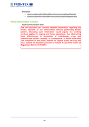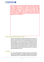 The non-disclosed Thermal vision devices part are usedcontains detailed for observation of theinformation regarding territory/landscape on the the modus operandi Host Member State inof law order enforcement to prevent unauthorized officials performing border crossings and withborder control. Disclosing such information would expose aim to detect illegal crossings of the EU external borders and other criminal the working methods applied in ongoing and future operations, thus obstructing activities that might be expected in the operational area base on risk their effectiveness in prevention of cross-border crime and assessment and previous operational findings (THB). When the irregular unauthorized border crossings. In consequence, it would undermine migrants and facilitators are spotted with use of the thermal the protection of the public interest as regards public security and vision cameras the thus, cannot information on thebe disclosed movement pursuant to is communicated tojoint Article teams 4(1)(a) who are first indent of patrolling Regulation the operational(EC) Noarea 1049/2001. in readiness to immediately react on detection/location of any kind of suspected illegal activities by the observation teams. The irregular migrants are apprehended accordingly. Night vision goggles and binoculars are used with the main aim to provide additional technical support to border guards while performing border surveillance duties at EU external land borders – to observe the operational area with the use of technical means. Helicopters or fix wing aircrafts carrying out surveillance are used as additional support to local authorities performing border surveillance duties on the ground. 12 Helicopters or fix wing aircrafts and are used according the threat and risk assessment for the particular border area and real operational needs (as for example for search and rescue missions). In additional to above presented border surveillance of land borders might be supported also with fixed cameras and sensor alarm systems, portable infrared 13 alarm/camera and other sensor systems. Such systems are managed and used by Home Members States authorities. Security and safety aspects of border surveillance Security and safety aspects of the border surveillance as such shall be also taken into account, due the fact that the irregular migrants are often put into dangerous situations while trying to cross the EU external land borders since the terrain (landscape as such, woods, areas without inhabitants) and other circumstances (severe weather conditions, flooding, etc.) at the border areas are quite often putting them in situations requiring search and rescue measures to be taken from local authorities. Measures taken for purpose of the border surveillance shall be conducted in the way that does not put at risk of safety of the persons apprehended or rescued. Joint Teams Joint Teams (comprising officers from the border guard services of the host MSs and Team Members (EBCGTs) - are obliged to maintain the highest standards of integrity, ethical conduct, professionalism and respect for and promotion of __________________________________________________________________________________ 41