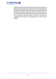 fundamental rights. While patrolling at the EU External land borders they are obliged to comply with the European, international law, fundamental rights and national law of the Member State. While performing their duties at EU external land borders (observation, patrolling) they shall not discriminate persons on grounds of sex, race or ethnic origin, religion, belief, age or sexual orientation and they are expected to treat every person with courtesy, respect and due consideration for the nature of any legitimate activity in which they are engaged. __________________________________________________________________________________ 42