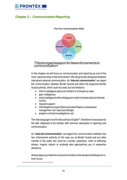 Chapter 2 – Communication/Reporting The strongest weapon for law enforcements is communication! In this chapter we will focus on communication and reporting as one of the most important tasks of law enforcement. We will generally distinguish between internal and external communication. As “internal communication” we regard the communication between Border Guards and within the respective Border Guard authority, which could be used, but not limited to: • inform colleagues about an incident or emergency case; • gain intelligence; • share intelligence with colleagues in order to initiate actions in border control; • request support; • fulfil obligation to report (Serious Incident Report), so that senior management can react accordingly; • prepare criminal investigations; etc. 14 The main language in any Frontex activity is English , therefore it is necessary for the staff deployed to be familiar with common standards in reporting and communication. As “external communication” we regard the communication between the law enforcement authority (in this case you as Border Guard) and any other member of the public who could be a traveler, perpetrator, victim of trafficking, witness, irregular migrant or anybody else approaching you in respective situations. Always adjust your behavior and communication to the situation and the person in front of you. __________________________________________________________________________________ 43