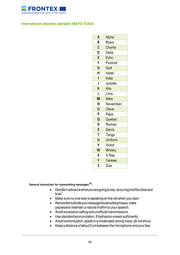 International phonetic alphabet (NATO/ ICAO): A Alpha B Bravo C Charlie D Delta E Echo F Foxtrott G Golf H Hotel I India J Juliette K Kilo L Lima M Mike N November O Oscar P Papa Q Quebec R Romeo S Sierra T Tango U Uniform V Victor W Whisky X X-Ray Y Yankee Z Zulu 15 General instruction for transmitting messages : • Decide in advance what you are going to say, ensuring it will be clear and brief. • Make sure no one else is speaking on the net when you start. • Remember to divide your message into sensible phrases, make pauses and maintain a natural rhythm to your speech. • Avoid excessive calling and unofficial transmissions. • Use standard pronunciation. Emphasize vowels sufficiently. • Avoid extreme pitch, speak in a moderately strong voice, do not shout. • Keep a distance of about 5 cm between the microphone and your lips. __________________________________________________________________________________ 45