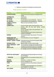 • Shield your microphone from background noises and wind Radio procedure words 16 PROWORD MEANING ACKNOWLEDGE! Confirm that you have received my message and will comply. AFFIRMATIVE Yes/Correct NEGATIVE No/Incorrect ALL AFTER … Everything that you (I) transmitted after … (Keyword) ALL BEFORE … Everything that you (I) transmitted before … (Keyword) CORRECT (THAT IS What you have transmitted is correct. CORRECT) CORRECTION An error has been made in this transmission. It will continue with the last word (group) correctly transmitted. An error has been made in this transmission. The correct version is … That which follows is a correct version in answer to your request for verification. WRONG Your last transmission was incorrect. The correct version is … DISREGARD THIS This transmission is an error. Disregard it. TRANSMISSION –OUT SILENCE – SILENCE – SILENCE Cease all transmissions on this net immediately. Will be maintained until lifted. SILENCE LIFTED Silence is lifted. The net is free for traffic. END OF MESSAGE – OVER This concludes the message just transmitted (and the (OUT) message instructions pertaining to a formal message). END OF TEXT The textual part of a formal message ends. Stand by for the message instructions immediately following. FETCH the shift-leader! I wish to speak on the radio to that person (in this case the shift-leader) …SPEAKING Requested person is now using the radio by him or herself. FIGURES Numerals or numbers will follow. MESSAGE I have a message for you. OVER This is the end of my turn of transmitting. A response is expected. OUT This is the end of my transmission to you. No answer or acknowledgment is expected. SAY AGAIN! Repeat all of your last transmission. __________________________________________________________________________________ 46