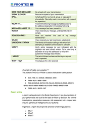 SEND YOUR MESSAGE! Go ahead with your transmission. SPEAK SLOWER! Reduce the speed of your transmission. SPELL I shall spell the next word, group or equivalent phonetically. (Normally used in connection with request for repetition) RELAY TO … Transmit the following message to all addressees or to the address designation immediately following. MESSAGE PASSED TO … Your message has been passed to … ROGER I have received your message, understand it and will comply. ROGER SO FAR? Have you received this part of my message satisfactorily? WILCO I have received your last transmission satisfactorily. UNKNOWN STATION The identity of the station calling or with whom I am attempting to establish communication is unknown. VERIFY Verify entire message (or part indicated) with the originator and send correct version. To be used only at discretion of or by the addressee to which the questioned message was directed. I VERIFY That which follows has been verified at your request and is repeated. WAIT – OUT I must pause for a few seconds Example of radio conversation : 17 The proword THIS IS or FROM is used to indicate the calling station. • ALFA – THIS – IS – CHARLIE – MESSAGE – OVER • FROM – ALFA – SEND – OVER • THIS–IS-CHARLIE–WATCH–FOR–FALLEN–ROCKS–ON–ROAD–BIRKET–I – SPELL - BRAVO – INDIA – ROMEO – KILO – ECHO – TANGO – BIRKET – OVER • FROM – ALFA – WILCO – OUT Report writing A report is a key element in the Border Guard work. It is a documentation of your performance and could be the basis for follow-up decisions like criminal investigations, preventative measures, risk assessment, etc. A report also ensures gathering of intelligence for your authority. In general, a report should provide answers to following questions: • Who? • What? • When? __________________________________________________________________________________ 47