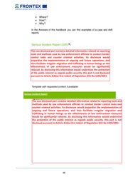 • Where? • How? • Why? In the Annexes of this handbook you can find examples of a case and shift reports. Serious Incident Report (SIR) 18: The non-disclosed A Serious part contains Incident Report is an alert detailed information message that relatedimmediately shall be reported to reporting tools (withinand methods 2 hours used by law after recognition) enforcement to FSC officials and the host to conduct MS’ authorities, border in case a control tasks occurs relevant incident and counter that needs criminal activities. urgent attention, Itsincident as the disclosure would may affect jeopardize the implementation of ongoing and future operations, or be relevant to the Frontex mission, its obligation, image, the safety and security and thus facilitate irregular migration and trafficking in human beings as the of participants in activities coordinated or led by Frontex, or any combination effectiveness of law enforcement measures would be significantly thereof, having special regard to any violation of Fundamental reduced. As disclosing this information would undermine the protection Rights. of the public interest as regards public security, this part is not disclosed pursuant to Article 4(1)(a) first indent of Regulation (EC) No 1049/2001. Template with requested content if available: Serious Incident Report Subject The non-disclosed part contains detailed information related to reporting tools and methods used by law enforcement officials to conduct border control tasks and counter criminal activities. Its disclosure would jeopardize the implementation of Joint Operation ongoing and future operations, and thus facilitate irregular migration and trafficking in Incident date/timehuman beings as the effectiveness of law enforcement measures would be significantly reduced. As disclosing this information would undermine the protection of the public interest as regards public security, this part is not Finding date/time disclosed pursuant to Article 4(1)(a) first indent of Regulation (EC) No 1049/2001. Location of the incident Reference to operational Inside area Outside Involved Frontex ressources; HR / TE __________________________________________________________________________________ 48