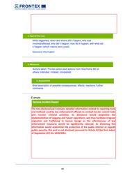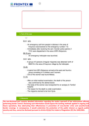 Source of information Reporting unit/person 1. Fact of the case What happened; when and where did it happen; who was involved/affected; why did it happen; how did it happen; with what did it happen (which means were used); Source of information 2. Measures Actions taken: Frontex actors and actions from Host/Home MS or others (intended, initiated, completed) 3. Assessment Brief description of possible consequences, effects, reactions, further comments Example: Serious Incident Report The non-disclosed part contains Subject detailed Dead migrantinformation found related to reporting tools and methods used by law enforcement officials to conduct border control tasks and counter Joint Operation criminal activities. Its disclosure JO Poseidon Land 2012 would jeopardize the implementation of ongoing and future operations, and thus facilitate irregular migration and trafficking in human beings as the effectiveness of law Incident date/time . . / 00:10 a.m. – 10:45 a.m. enforcement measures would be significantly reduced. As disclosing this information would undermine the protection of the public interest as regards public security, this part is not disclosed pursuant to Article 4(1)(a) first indent Finding date/time . . / 10:30 a.m. of Regulation (EC) No 1049/2001. Location of the incident Kraynovo village, Bulgaria Reference to operational Inside area Outside __________________________________________________________________________________ 49